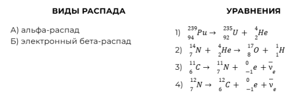 Установите соответствие между видами радиоактивного распада и уравнениями, описывающими этот процесс.