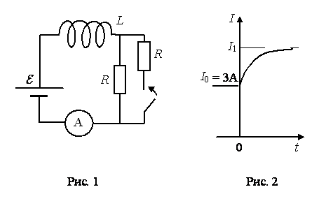 В момент времени t = 0 ключ замыкают, что приводит к изменениям силы тока, регистрируемым амперметром, как показано на рис. 2. Основываясь на известных физических законах, объясните, почему при замыкании ключа сила тока плавно увеличивается до некоторого нового значения – I1. Определите значение силы тока I1. Внутренним сопротивлением источника тока пренебречь.