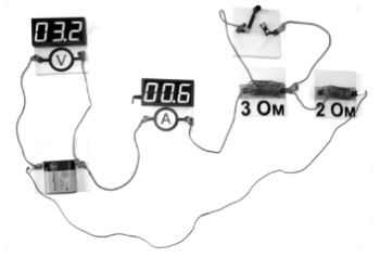 На фотографии изображена электрическая цепь. Начертите принципиальную схему этой электрической цепи. Опираясь на законы постоянного тока, объясните, как должны измениться (уменьшиться, увеличиться или остаться прежними) показания идеальных амперметра и вольтметра при замыкании ключа. Сопротивлением подводящих проводов и ключа пренебречь. Явление самоиндукции не учитывать.