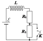 Катушка, обладающая индуктивностью L, соединена последовательно с источником постоянного тока с ЭДС и резисторами R1 и R2, имеющими одинаковое сопротивление , как показано на рисунке. В начальный момент ключ в цепи разомкнут. Как изменятся сила тока в цепи и напряжение на участке цепи, содержащем резистор R1, после замыкания ключа? Ответ поясните, опираясь на законы электродинамики. Внутренним сопротивлением источника тока и сопротивлением катушки пренебречь.
