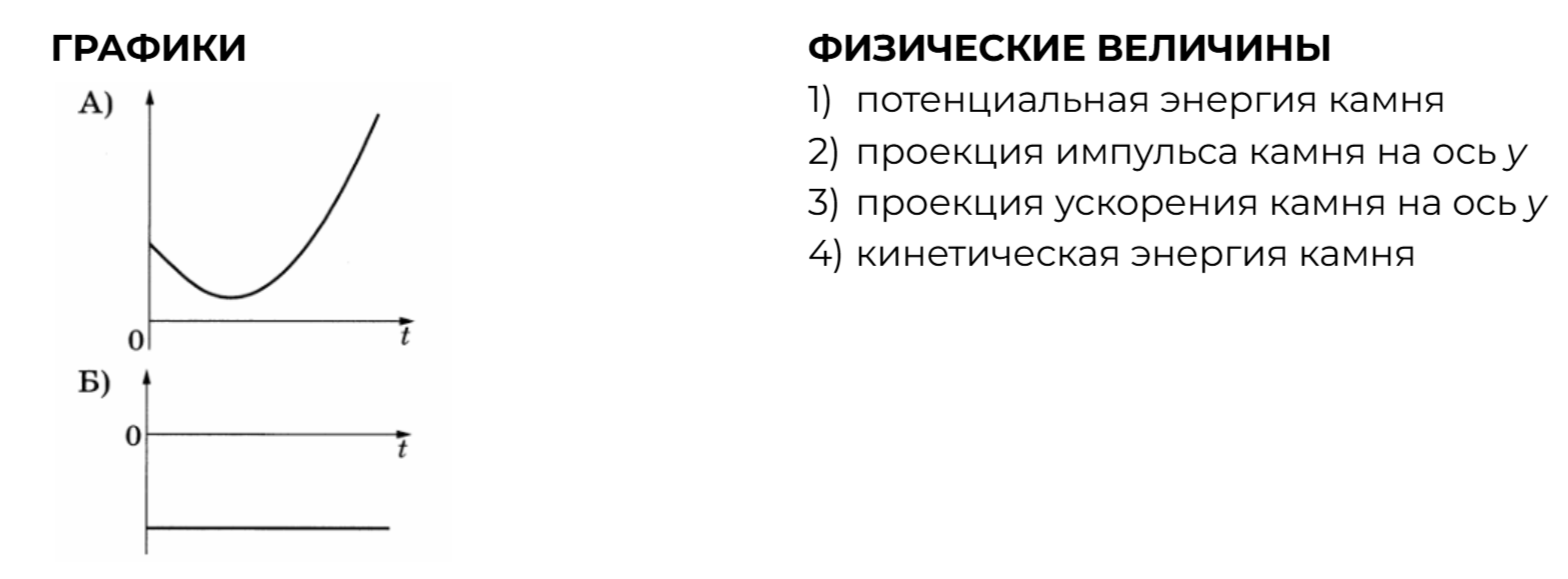 Установите соответствие между графиками и физическими величинами, зависимость которых от времени эти графики могут представлять. (Сопротивлением воздуха пренебречь. Потенциальная энергия камня отсчитывается от уровня у = 0.)