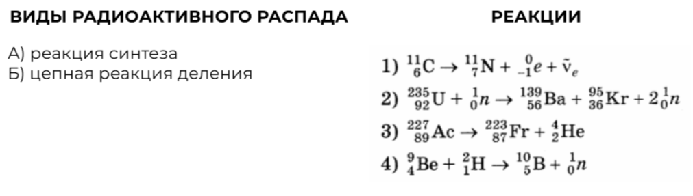 Установите соответствие между видами ядерных превращений и реакциями, описывающими эти процессы. К каждой позиции первого столбца подберите соответствующую позицию из второго столбца и запишите в таблицу выбранные цифры под соответствующими буквами.