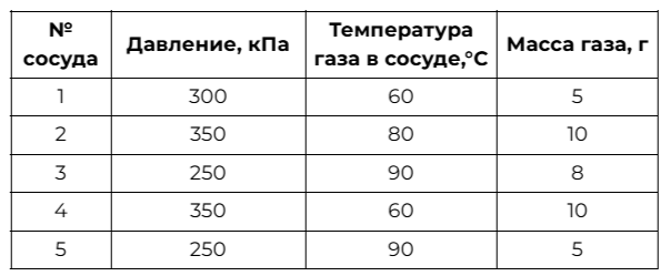 Ученику необходимо на опыте обнаружить зависимость объема газа, находящегося в сосуде под подвижным поршнем, от массы газа. У нeгo имеется пять различных сосудов с манометрами. Сосуды наполнены одним и тем же газом при различных температурах и давлениях (см. таблицу).