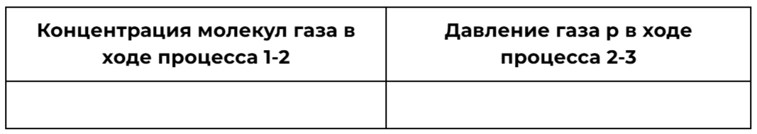 Один моль одноатомного идеального газа участвует в процессе 1-2-3, график которого изображен на рисунке в координатах V-T, где V - объем газа, T - абсолютная температура газа. Как изменяется концентрация молекул газа n в ходе процесса 1-2 и давление газа р в ходе процесса 2-3?