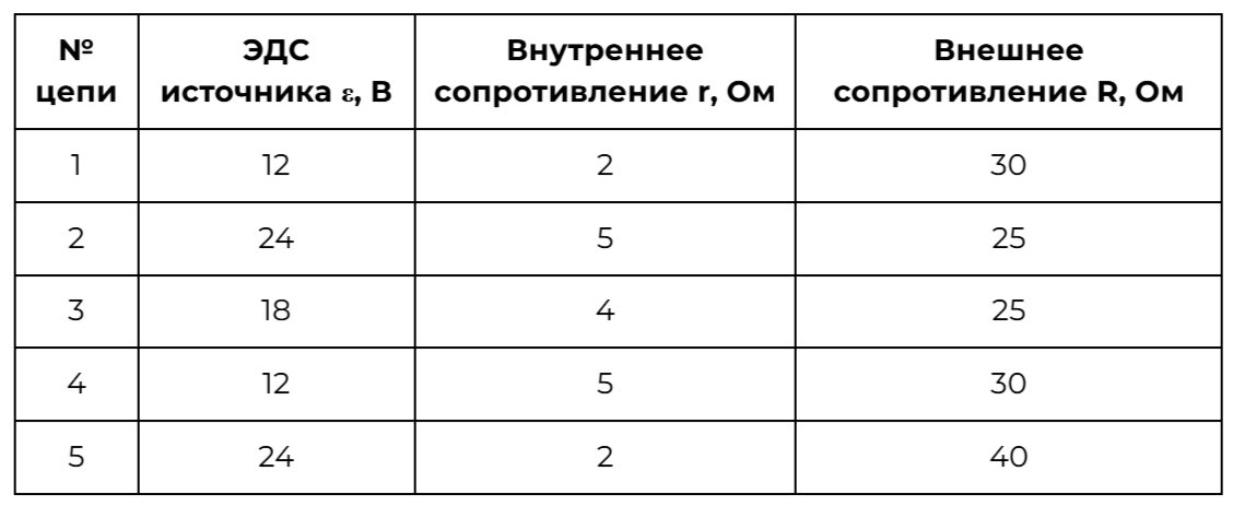 Какие две цепи необходимо взять ученику для того, чтобы на опыте исследовать зависимость силы тока, протекающего в цепи, от внутреннего сопротивления источника?