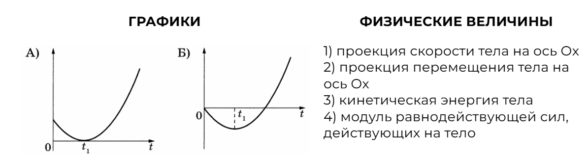 На рисунке показан график зависимости координаты x тела, движущегося вдоль оси Ox, от времени t (парабола). Графики А и Б представляют собой зависимости физических величин, характеризующих движение этого тела, от времени t.