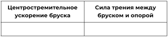В школьном опыте брусок, помещенный на горизонтальный диск, вращается вместе с ним с некоторой угловой скоростью. В ходе опыта угловую скорость диска уменьшили. При этом положение бруска на диске осталось прежним. Как изменились при этом центростремительное ускорение бруска и сила трения между бруском и опорой?