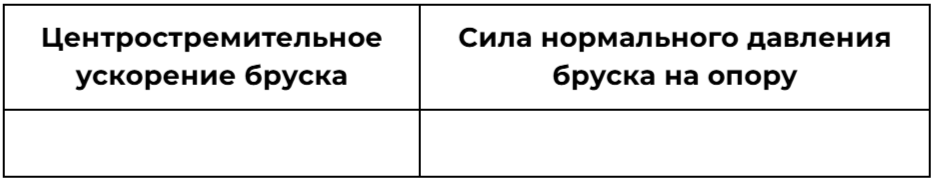 В школьном опыте брусок, помещенный на горизонтальный диск, вращается вместе с ним с некоторой угловой скоростью. В ходе опыта угловую скорость диска увеличили. При этом положение бруска на диске осталось прежним. Как изменились при этом центростремительное ускорение бруска и сила нормального давления бруска на опору?