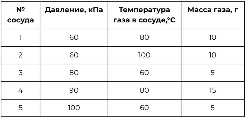 Необходимо на опыте обнаружить зависимость объема газа, находящегося в сосуде под подвижным поршнем, от внешнего давления. Имеются пять различных сосудов с манометрами. Сосуды наполнены одним и тем же газом при различных температурах и давлениях (см. таблицу). Какие два сосуда необходимо взять ученику, чтобы провести данное исследование?