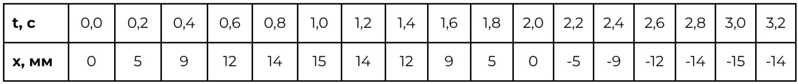 В таблице представлены данные о положении шарика, прикрепленного к пружине и совершающего незатухающие колебания вдоль горизонтальной оси Ох, в различные моменты времени.