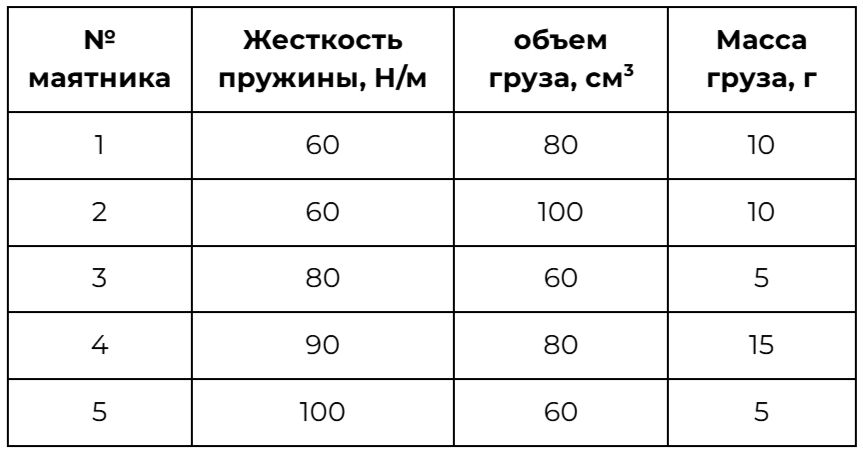 Ученику необходимо на опыте выяснить, зависит ли частота свободных колебаний пружинного маятника от объема груза. У него имеется пять пружинных маятников, характеристики которых приведены в таблице. Какие два маятника необходимо взять ученику, чтобы провести данное исследование?