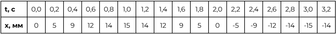 В таблице представлены данные о положении шарика, прикрепленного к пружине и совершающего незатухающие колебания вдоль горизонтальной оси Ох, в различные моменты времени.