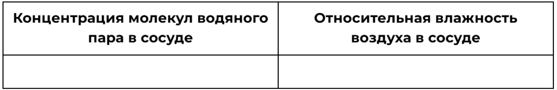 В закрытом сосуде постоянного объема при комнатной температуре долгое время находится влажный воздух. На стенках внутри сосуда видна обильная poca. Температуру воздуха медленно увеличили на 20 К. Poca на стенках сосуда при этом не пропала. Как изменились при этом концентрация молекул водяного пapa и относительная влажность воздуха в сосуде?