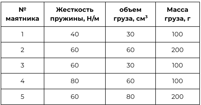Ученику необходимо на опыте выяснить, зависит ли частота свободных колебаний пружинного маятника от жесткости пружины. У него имеется пять пружинных маятников, характеристики которых приведены в таблице. Какие два маятника необходимо взять ученику, чтобы провести данное исследование?
