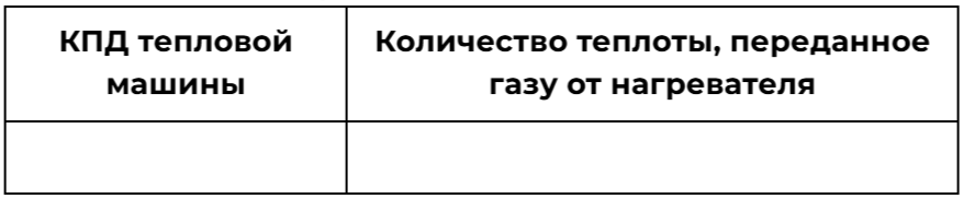 Тепловая машина работает по циклу Карно. Температуру нагревателя тепловой машины повысили, оставив температуру холодильника прежней. Количество теплоты, отданное газом холодильнику за цикл, не изменилось. Как изменились при этом КПД тепловой машины и количество теплоты, переданное газу от нагревателя?