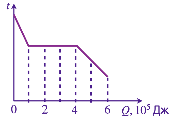 На рисунке показан график зависимости температуры вещества в процессе теплообмена с окружающей средой от отдаваемого им количества теплоты. Масса вещества равна 1,2 кг. Первоначально вещество было в газообразном состоянии. Какова удельная теплота плавления вещества? Ответ дайте в кДж/кг.