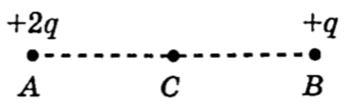 Две маленькие закреплённые металлические бусинки, расположенные в точках А и В, несут на себе заряды +2q > 0 и +q соответственно (см. рисунок). Точка С расположена посередине отрезка АВ. Внешнее электрическое поле отсутствует. Из приведённого ниже списка выберите все правильные утверждения относительно