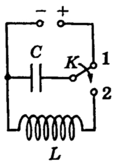 Конденсатор идеального колебательного контура длительное время подключён к источнику постоянного напряжения (см. рисунок). В момент t = 0 переключатель К перевели из положения 1 в положение 2. Графики А и В отражают изменение с течением времени физических величин, характеризующих свободные электромагнитные колебания, возникшие в контуре после этого