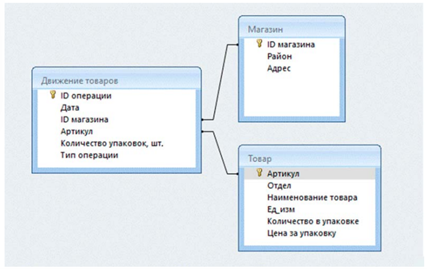 Таблица «Движение товаров» содержит записи о поступлении товаров со склада в магазины в течение июня 2023 г.,