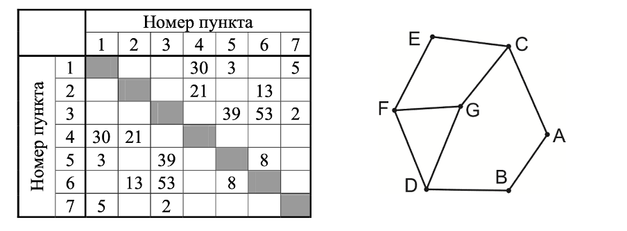 Так как таблицу и схему рисовали независимо друг от друга, нумерация населённых пунктов в таблице никак не связана с буквенными обозначениями на графе. Определите, какова сумма протяжённостей дорог из пункта D в пункт G и из пункта A в пункт C.