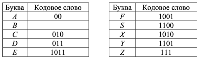 По каналу связи передаются шифрованные сообщения, содержащие только десять букв: A, B, C, D, E, F, S, X, Y, Z; для передачи используется неравномерный двоичный код. Для кодирования букв используются кодовые слова.