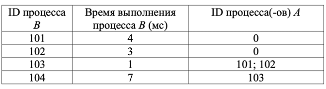 Информация о процессах представлена в файле в виде таблицы. В первом столбце таблицы указан идентификатор процесса (ID), во втором столбце таблицы – время его выполнения в миллисекундах, в третьем столбце перечислены с разделителем «;» ID процессов, от которых зависит данный процесс. Если процесс независимый, то в таблице указано значение 0.