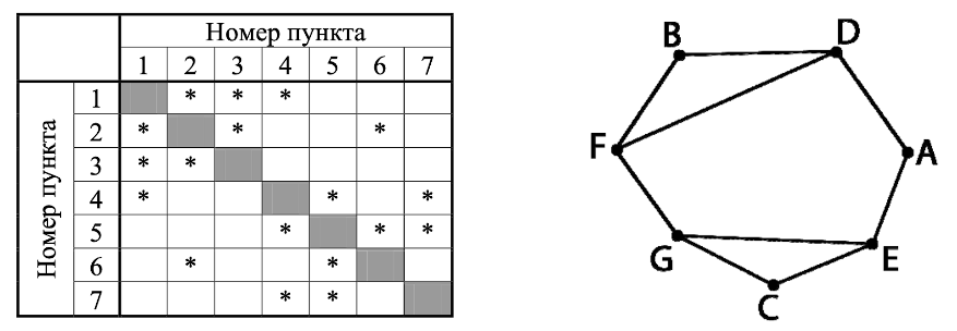 На рисунке изображена схема дорог N-ского района. В таблице звёздочкой обозначено наличие дороги из одного населённого пункта в другой. Отсутствие звёздочки означает, что такой дороги нет.