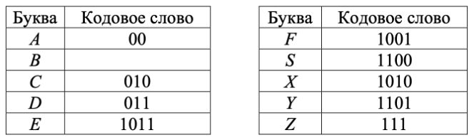 По каналу связи передаются сообщения, содержащие только восемь букв: А, Б, В, Г, Д, Е, Ж и З. Для передачи используется двоичный код, удовлетворяющий условию Фано.