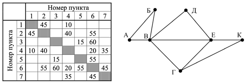 Так как таблицу и схему рисовали независимо друг от друга, нумерация населённых пунктов в таблице никак не связана с буквенными обозначениями на графе. Определите, какова длина дороги из пункта К в пункт Е.