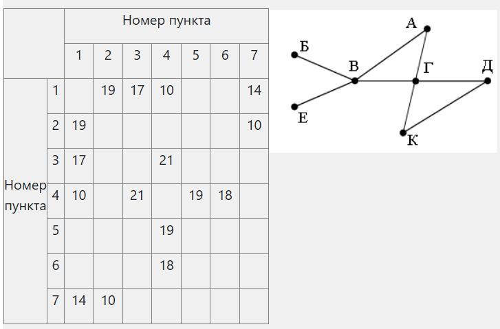 Так как таблицу и схему рисовали независимо друг от друга, то нумерация населённых пунктов в таблице никак не связана с буквенными обозначениями на графе. Определите, какова протяжённость дороги