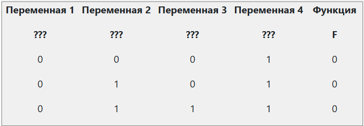 Определите, какому столбцу таблицы истинности функции F соответствует каждая из переменных w, x, y, z.