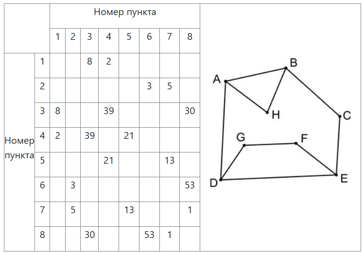 не связана с буквенными обозначениями на графе. Определите, какова сумма протяжённостей дорог из пункта B в пункт H и из пункта E в пункт D.