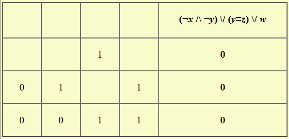 Миша заполнял таблицу истинности функции (¬x /\ ¬y) \/ (y≡z) \/ w, но успел заполнить лишь фрагмент из трёх различных её строк, даже не указав, какому столбцу таблицы соответствует каждая из переменных w, x, y, z.