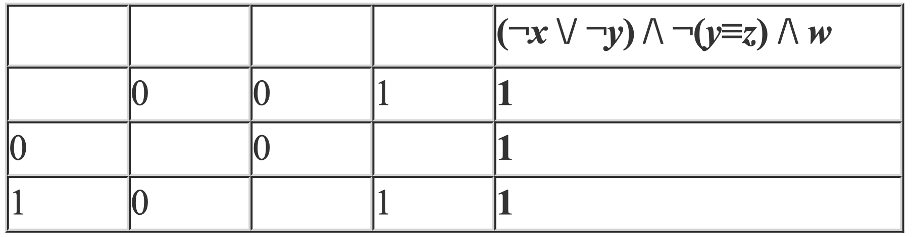 Миша заполнял таблицу истинности функции (¬x \/ ¬y) /\ ¬(y≡z) /\ w, но успел заполнить лишь фрагмент из трёх различных её строк, даже не указав, какому столбцу таблицы соответствует каждая из переменных w, x, y, z.