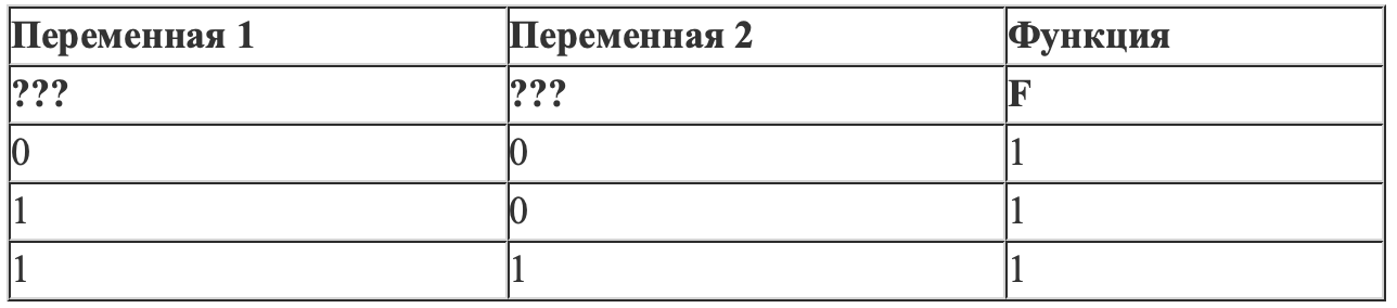 Пример. Если бы функция была задана выражением ¬x \/ y, зависящим от двух переменных: x и y, и был приведён фрагмент её таблицы истинности, содержащий все наборы аргументов, при которых функция истинна.