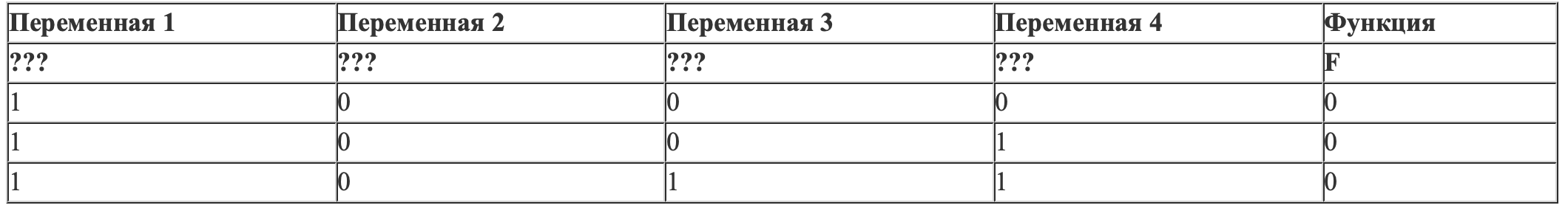 Определите, какому столбцу таблицы истинности функции F соответствует каждая из переменных w, x, y, z.