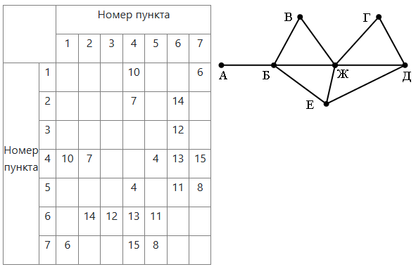 Так как таблицу и схему рисовали независимо друг от друга, то нумерация населённых пунктов в таблице никак не связана с буквенными обозначениями на графе. Определите, какова протяжённость дороги из пункта Г в пункт Ж. В ответе запишите целое число – так, как оно указано в таблице.