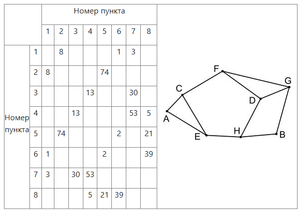Так как таблицу и схему рисовали независимо друг от друга, нумерация населённых пунктов в таблице никак не связана с буквенными обозначениями на графе. Определите, какова сумма протяжённостей дорог из пункта A в пункт C и из пункта B в пункт H.