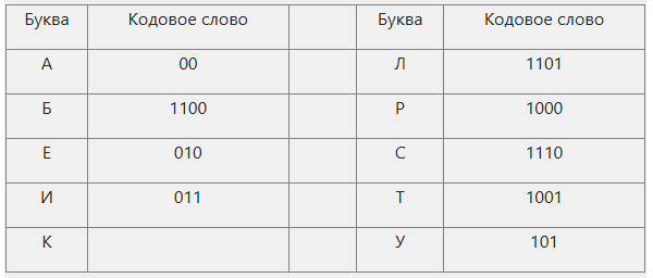 По каналу связи передаются шифрованные сообщения, содержащие только десять букв: А, Б, Е, И, К, Л, Р, С, Т, У; для передачи используется неравномерный двоичный код. Для девяти букв используются кодовые слова.