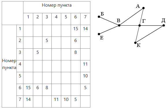 Так как таблицу и схему рисовали независимо друг от друга, то нумерация населённых пунктов в таблице никак не связана с буквенными обозначениями на графе. Определите, какова протяжённость дороги из пункта А в пункт Г. В ответе запишите целое число – так, как оно указано в таблице.