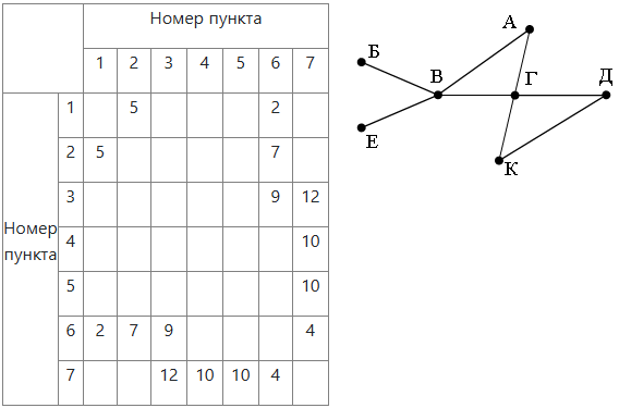 Так как таблицу и схему рисовали независимо друг от друга, то нумерация населённых пунктов в таблице никак не связана с буквенными обозначениями на графе. Определите, какова протяжённость дороги из пункта А в пункт В. В ответе запишите целое число – так, как оно указано в таблице.