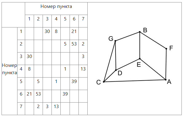 Так как таблицу и схему рисовали независимо друг от друга, нумерация населённых пунктов в таблице никак не связана с буквенными обозначениями на графе. Определите, какова сумма протяжённостей дорог из пункта G в пункт B и из пункта C в пункт A.