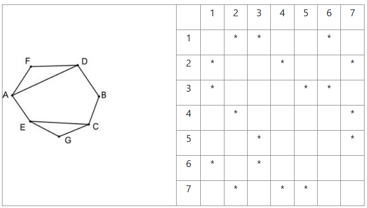На рисунке слева изображена схема дорог Н-ского района, в таблице звёздочкой обозначено наличие дороги из одного населённого пункта в другой. Отсутствие звёздочки означает, что такой дороги нет.