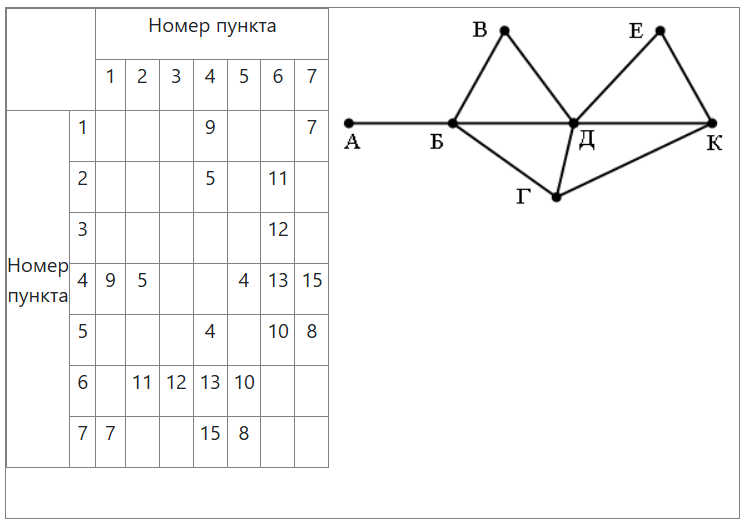 Так как таблицу и схему рисовали независимо друг от друга, то нумерация населённых пунктов в таблице никак не связана с буквенными обозначениями на графе. Определите, какова протяжённость дороги из пункта Д в пункт Е. В ответе запишите целое число – так, как оно указано в таблице.