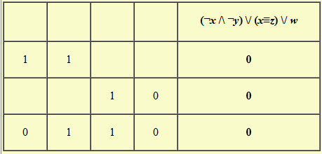 Миша заполнял таблицу истинности функции (¬x /\ ¬y) \/ (x≡z) \/ w, но успел заполнить лишь фрагмент из трёх различных её строк, даже не указав, какому столбцу таблицы соответствует каждая из переменных w, x, y, z.