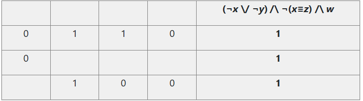 Миша заполнял таблицу истинности функции (¬x \/ ¬y) /\ ¬(x≡z) /\ w, но успел заполнить лишь фрагмент из трёх различных её строк, даже не указав, какому столбцу таблицы соответствует каждая из переменных w, x, y, z.