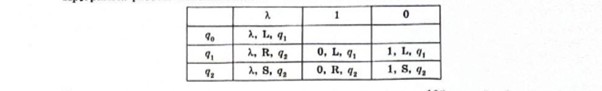 Символы «L» и «R› означают сдвиг в левую или правую ячейки соответственно, «N> - отсутствие сдвига, «S» - завершение работы исполнителя МТ после выполнения текущей команды. Сдвиг происходит после записи символа в текущую ячейку. Третий элемент - новое состояние головки после выполнения команды. Например, команда 0, L, qз выполняется следующим образом: в текущую ячейку записывается символ «0», затем головка сдвигается в соседнюю слева ячейку и переходит в состояние qз.