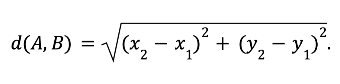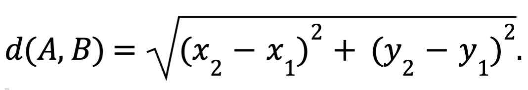 Будем называть центром кластера точку этого кластера, сумма расстояний от которой до всех остальных точек кластера минимальна. Для каждого кластера гарантируется единственность его центра. Расстояние между двумя точками на плоскости A(x1, y1) и B(x2, y2) вычисляется по формуле: