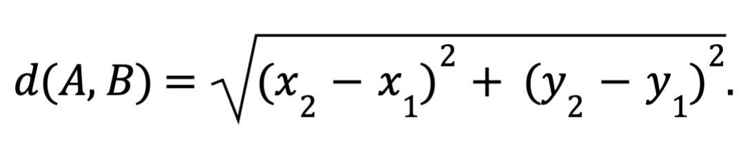 Будем называть центром кластера точку этого кластера, сумма расстояний от которой до всех остальных точек кластера минимальна. Для каждого кластера гарантируется единственность его центра. Расстояние между двумя точками на плоскости A(x1,y1) и B(x2,y2) вычисляется по формуле: