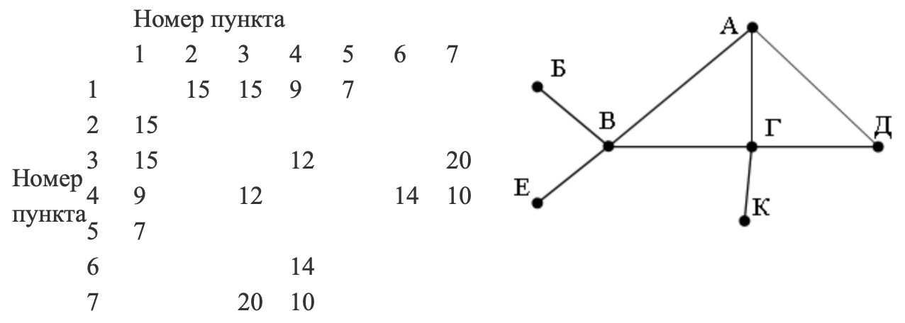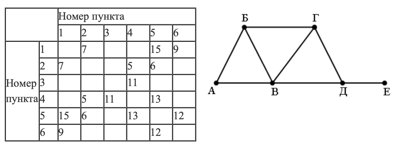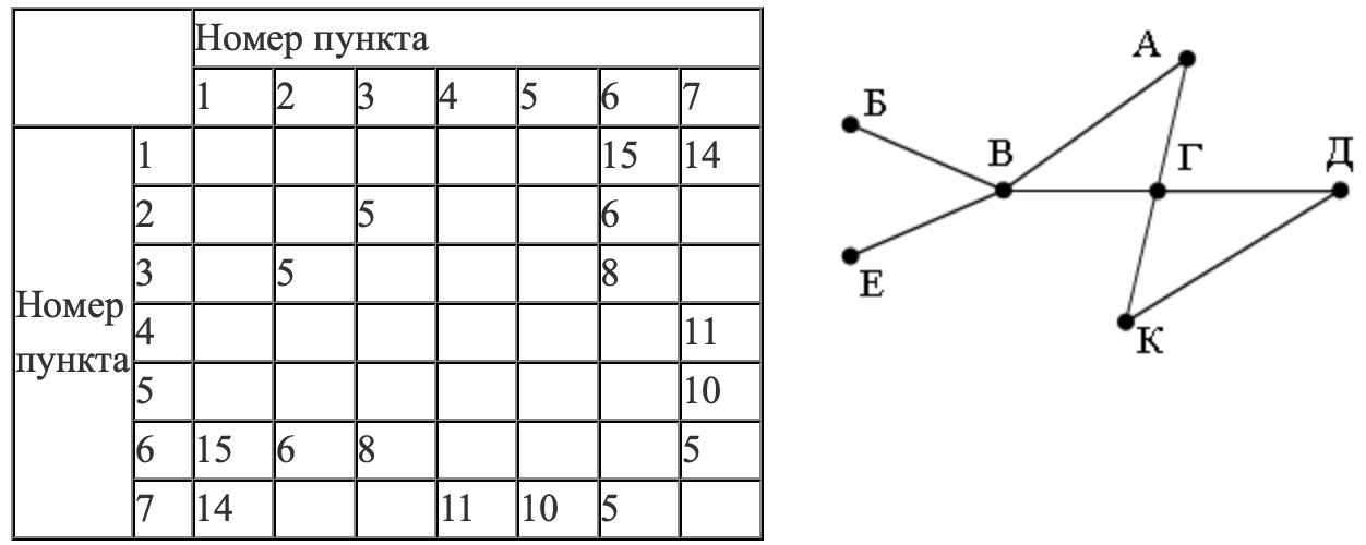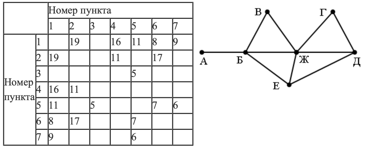 Так как таблицу и схему рисовали независимо друг от друга, то нумерация населённых пунктов в таблице никак не связана с буквенными обозначениями на графе. Определите, какова протяжённость дороги из пункта Г в пункт Д. В ответе запишите целое число – так, как оно указано в таблице.